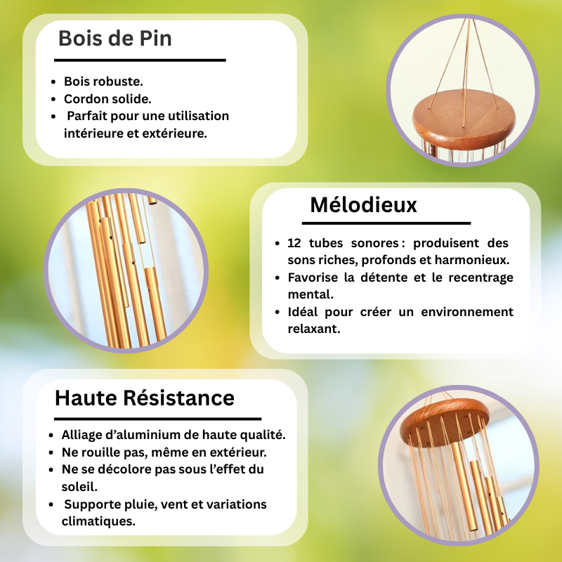 Avec ses 12 tubes en alliage d’aluminium, ce carillon génère des sons profonds, riches et harmonieux, parfaits pour créer une atmosphère de détente.