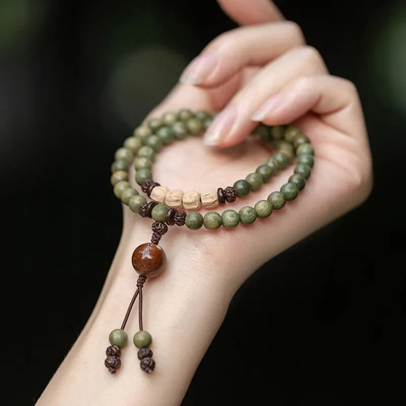 Offrez à votre esprit un moment de calme profond avec ce bracelet mala traditionnel en bois de santal vert, reconnu pour ses vertus d’apaisement, de méditation et d’ancrage spirituel. Avec ses 108 perles en bois naturel, il peut être porté au poignet ou en collier, selon vos envies.