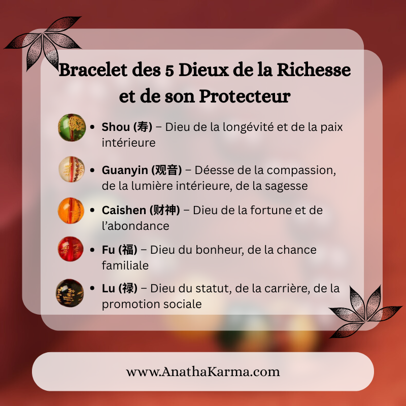 Ce bracelet unique est inspiré des Cinq Dieux de la Richesse de la tradition chinoise.