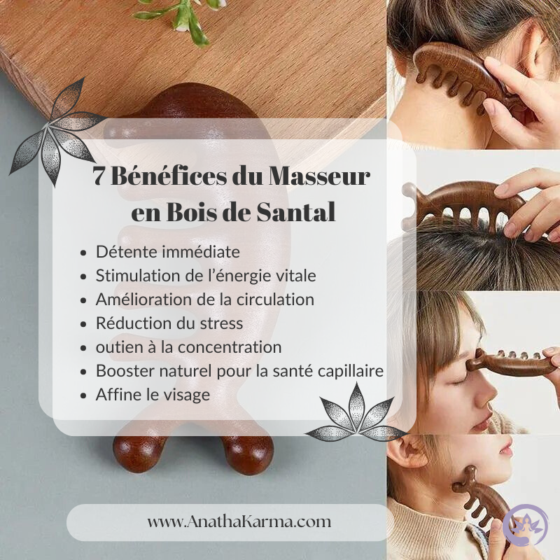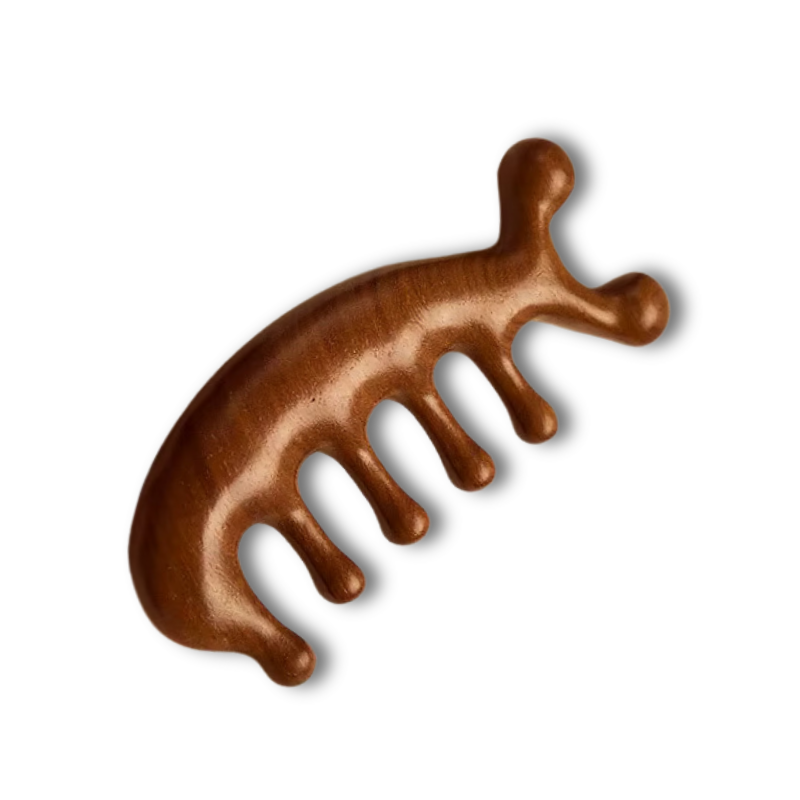 Découvrez le masseur méridien en bois de santal, un outil artisanal de bien-être conçu en forme de peigne. Doté de 7 points d’acupression, il offre relaxation et stimulation énergétique.