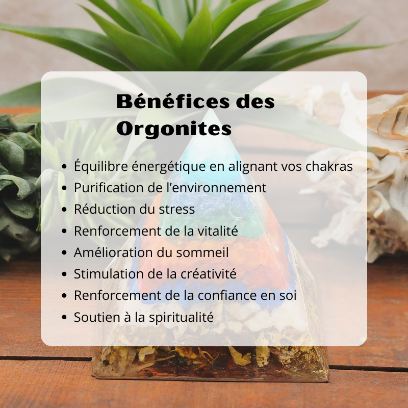 Une Orgonite est un mélange de résine, de métaux et de cristaux, conçu pour absorber les énergies négatives et les convertir en énergie positive. Les orgonites en pyramide ou en pendentif agissent comme un champ énergétique qui purifie l’environnement ou le porteur, en équilibrant les vibrations énergétiques